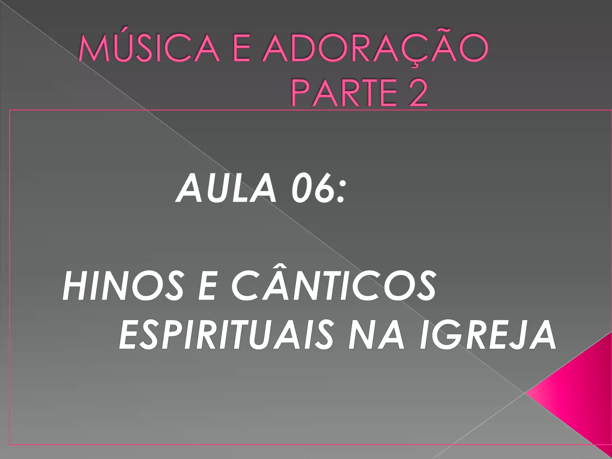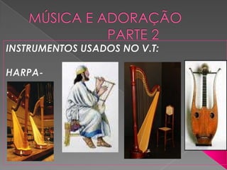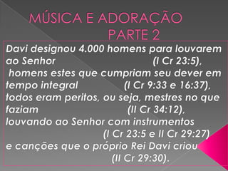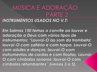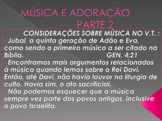 O documento discute a música e adoração no Antigo e Novo Testamento. No Antigo Testamento, a música era usada no Templo, mas após sua destruição, passou-se a usar na sinagoga, com cânticos, salmos e hinos. No Novo Testamento, Jesus e os apóstolos cantavam e o foco passou de Jesus como o novo Templo. O documento também reflete sobre a função da música no culto e questões sobre estilos musicais.