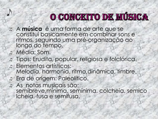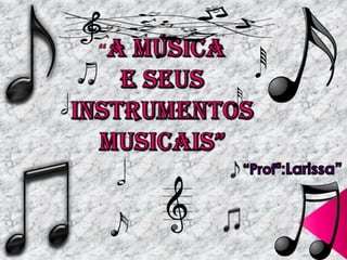O documento discute diversos instrumentos musicais, descrevendo suas origens, características e como os sons são produzidos. Instrumentos como guitarra, baixo, bateria, saxofone, piano, violão, teclado e harpa são explicados, além de conceitos como melodia, ritmo e notas musicais.