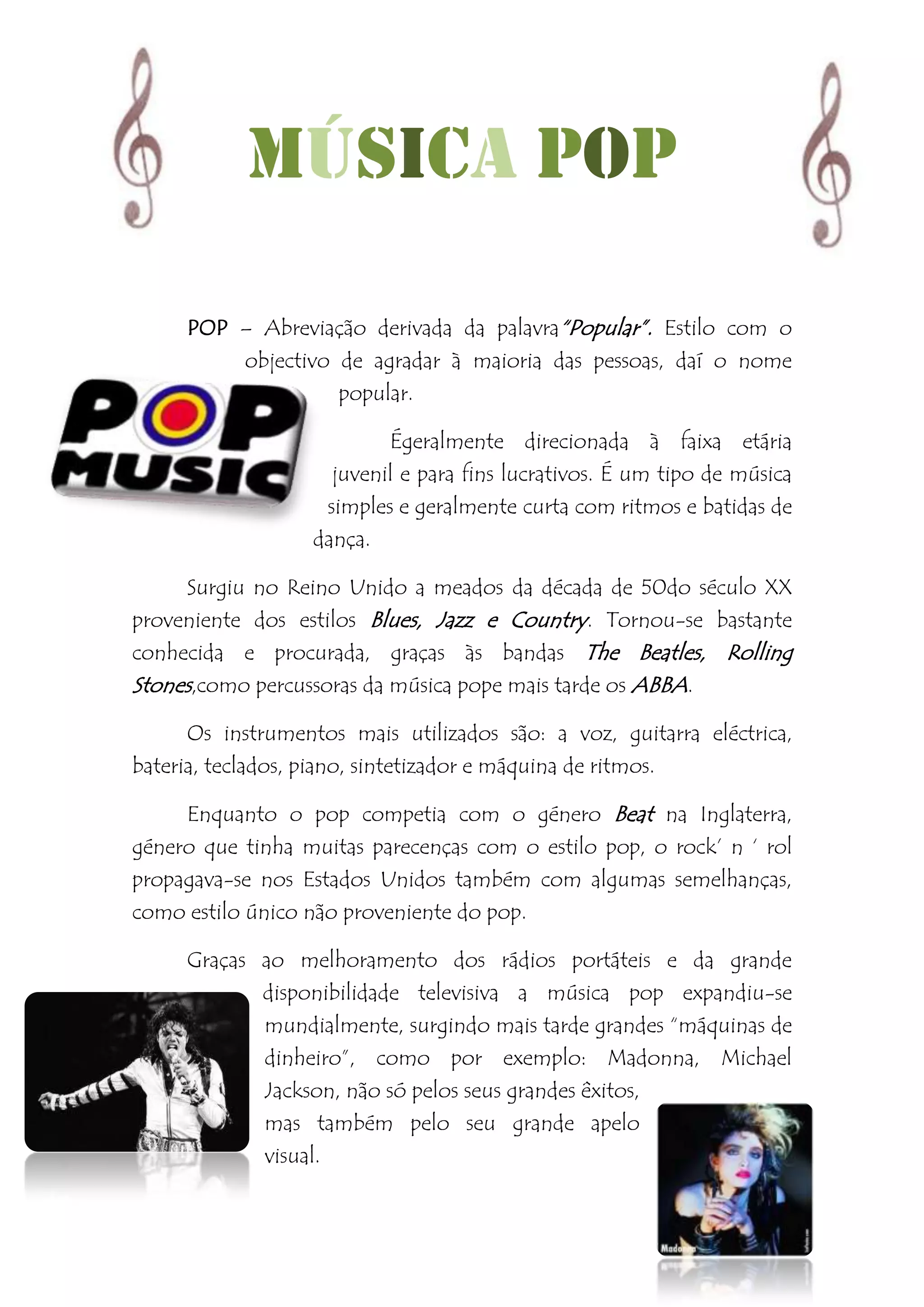 A música pop surgiu no Reino Unido na década de 1950 como um estilo musical simples e curto com ritmos de dança para agradar ao público em geral. Tornou-se popular mundialmente graças a bandas como os Beatles e Rolling Stones e acabou se diversificando em vários subgêneros como europop e dance-pop devido à sua rápida expansão com a melhoria da televisão e rádios portáteis.
