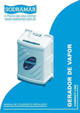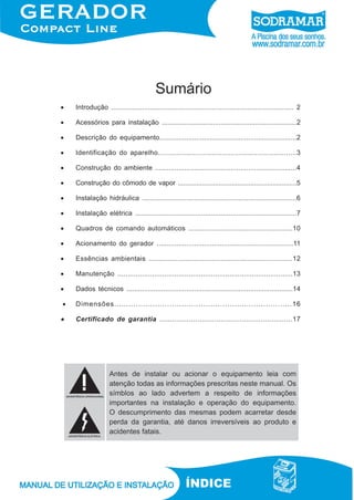 Este documento fornece instruções para instalação e manutenção de um gerador de vapor compacto. Detalha os requisitos para a construção do ambiente de sauna e instalação hidráulica e elétrica do equipamento. Inclui informações sobre acessórios, identificação do aparelho, operação, manutenção e especificações técnicas.