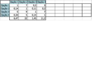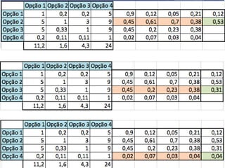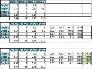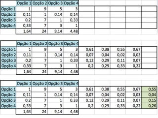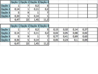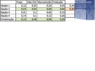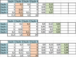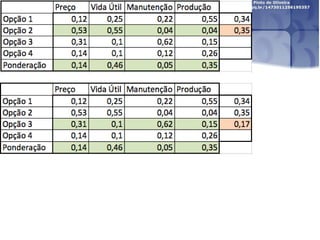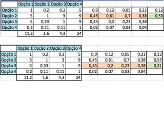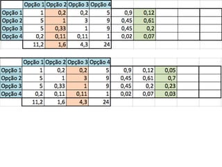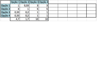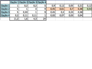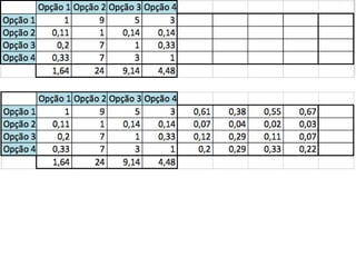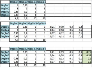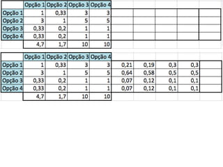 O documento descreve o Método de Análise Hierárquica (AHP) para tomada de decisões e fornece um exemplo de sua aplicação para escolher a melhor solução para manter um servidor ligado de forma ininterrupta para um pesquisador. O método envolve estruturar critérios e alternativas em uma hierarquia, definir prioridades através de julgamentos paritários usando uma escala numérica, e calcular vetores de prioridade para identificar a alternativa ótima.
