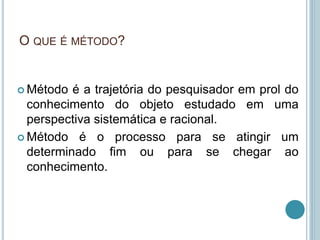 O documento discute diferentes métodos científicos como indutivo, dedutivo, hipotético-dedutivo e dialético. Explica que o método é o processo para se atingir o conhecimento de um objeto de estudo de forma sistemática. Também apresenta exemplos para ilustrar como cada método funciona.
