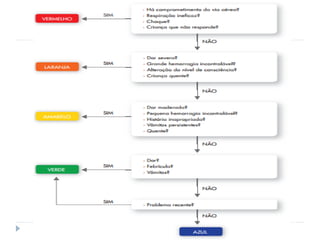 O documento discute o método de classificação de risco de Manchester para triagem de pacientes em serviços de urgência e emergência. Ele explica o processo de triagem, incluindo a identificação do problema do paciente, a coleta de informações, a avaliação de alternativas e a implementação de uma classificação de risco. O documento também descreve os cinco níveis de prioridade e os discriminadores gerais e específicos utilizados na avaliação.