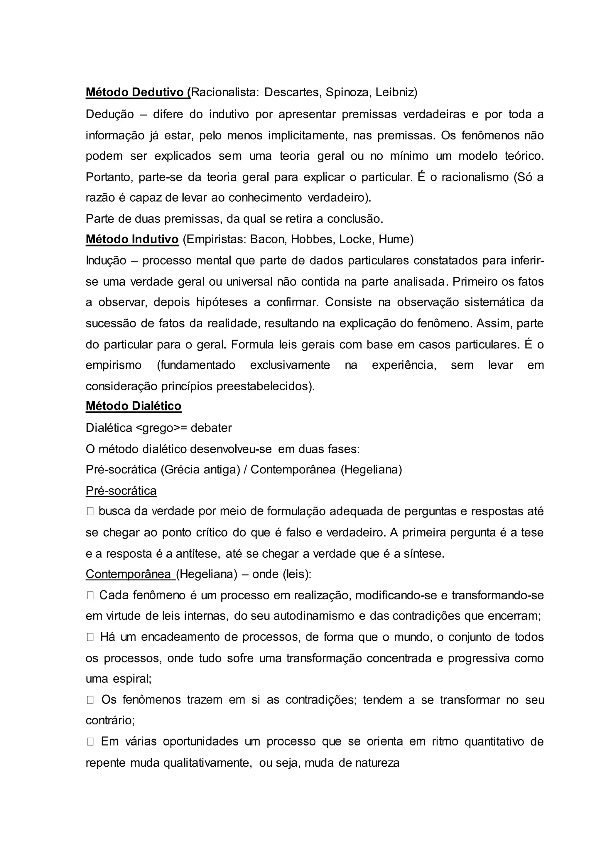 O documento descreve vários métodos científicos, incluindo o método dedutivo, indutivo, dialético, sistêmico, histórico, comparativo, tipológico, monográfico, estatístico, funcionalista, estruturalista, positivismo, positivismo lógico, funcionalismo e materialismo histórico.