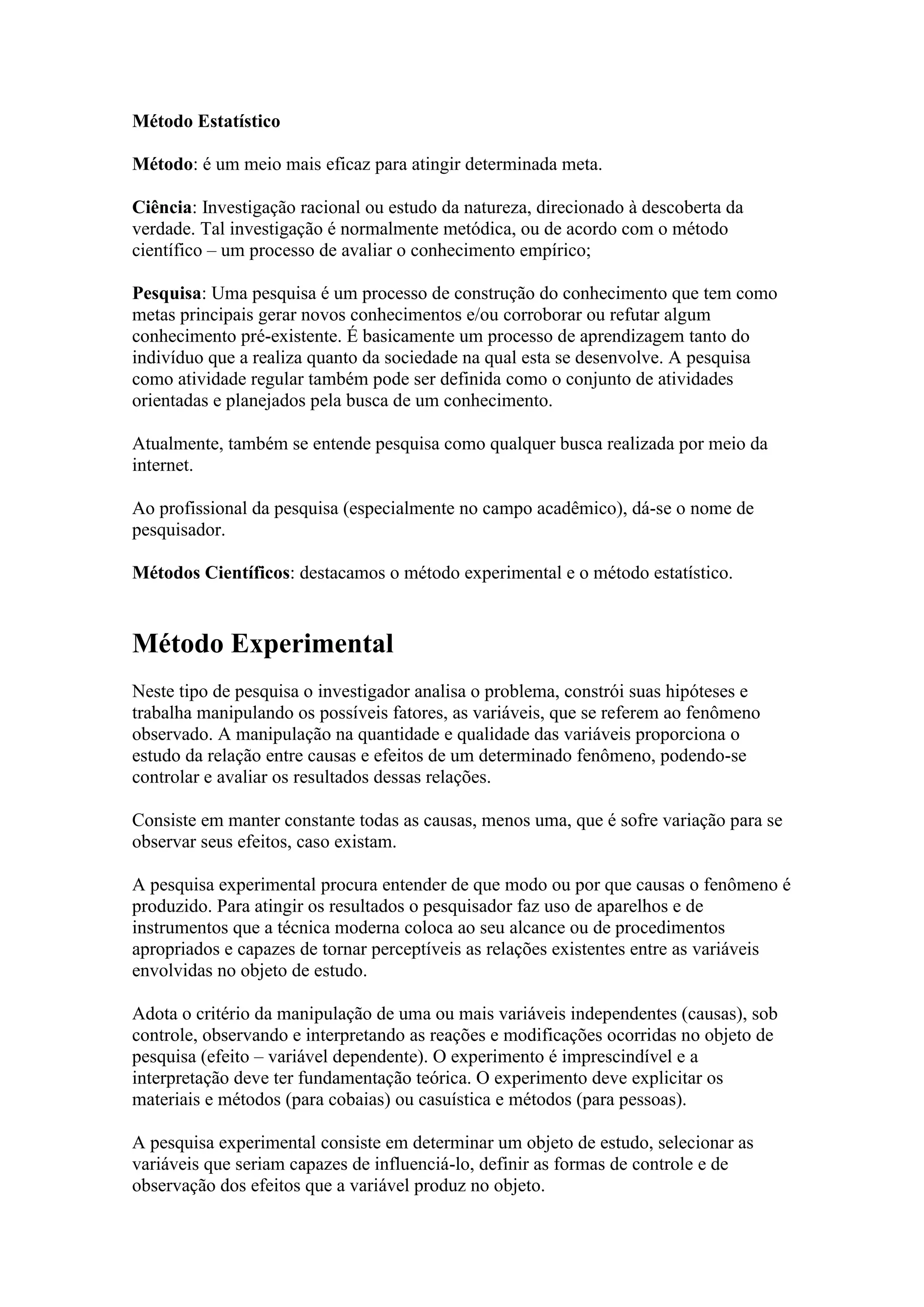 O documento descreve dois métodos científicos principais: o método experimental e o método estatístico. O método experimental envolve manipular variáveis independentes para observar seus efeitos nas variáveis dependentes, enquanto o método estatístico analisa fenômenos aleatórios coletando e analisando dados quantitativos para fazer inferências sobre a população.