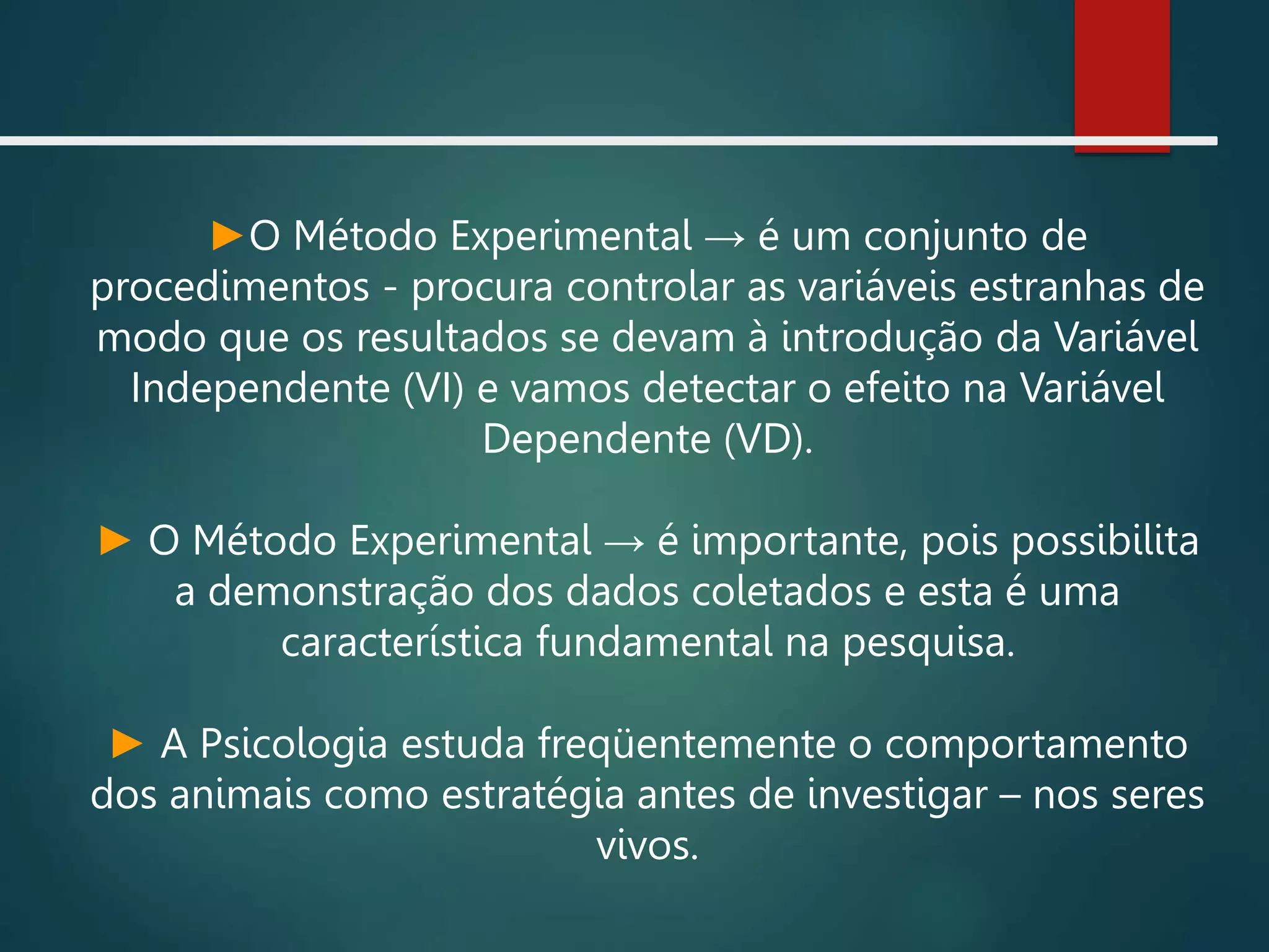 O documento discute o método experimental na psicologia, que controla variáveis externas para investigar o efeito de uma variável independente na variável dependente. Ele explica que variáveis são fatores mensuráveis que podem assumir diferentes valores e define variáveis independentes como aquelas controladas pelo pesquisador e variáveis dependentes como aquelas observadas nos participantes.