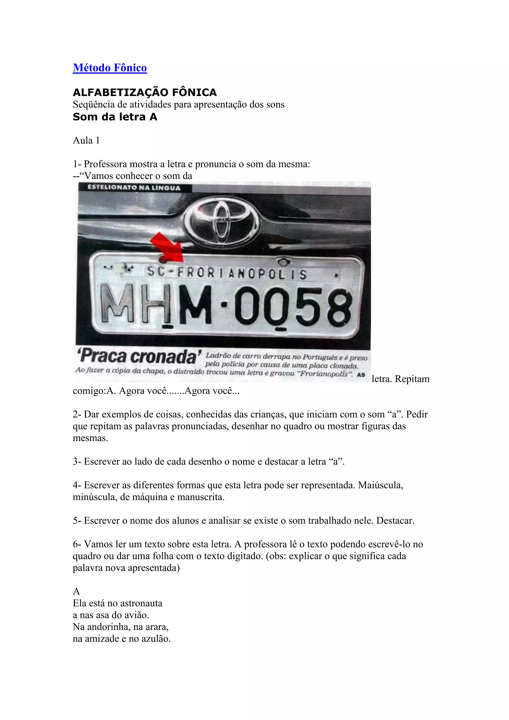 1) O documento apresenta um método fônico para ensinar alfabetização, com atividades para introduzir cada som. 2) Inclui exemplos de atividades como mostrar objetos com determinado som, ler textos, escrever letras, entre outras. 3) Fornece dicas como associar grafema-fonema, variar atividades e avaliar os avanços dos alunos.