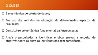 [1] O método observacional é uma técnica de coleta de dados usando os sentidos para obter aspectos da realidade de forma direta e sem depender de introspecção ou reflexão. [2] Oferece vantagens como estudar fenômenos de forma ampla e coletar dados sobre atitudes, mas tem desvantagens como a interferência de fatores imprevistos. [3] Existem diferentes tipos de observação como sistemática, assistemática, participante e não participante.