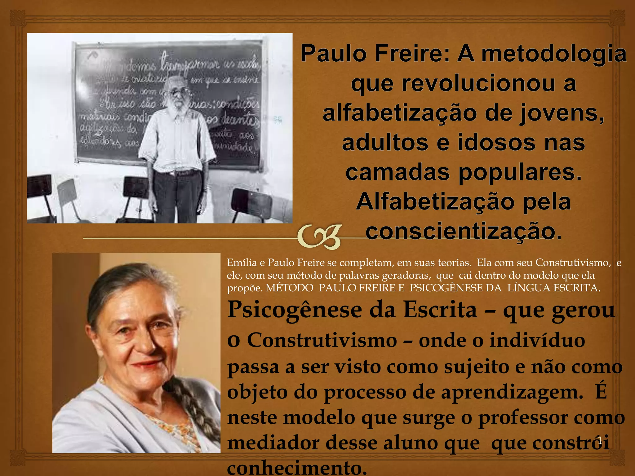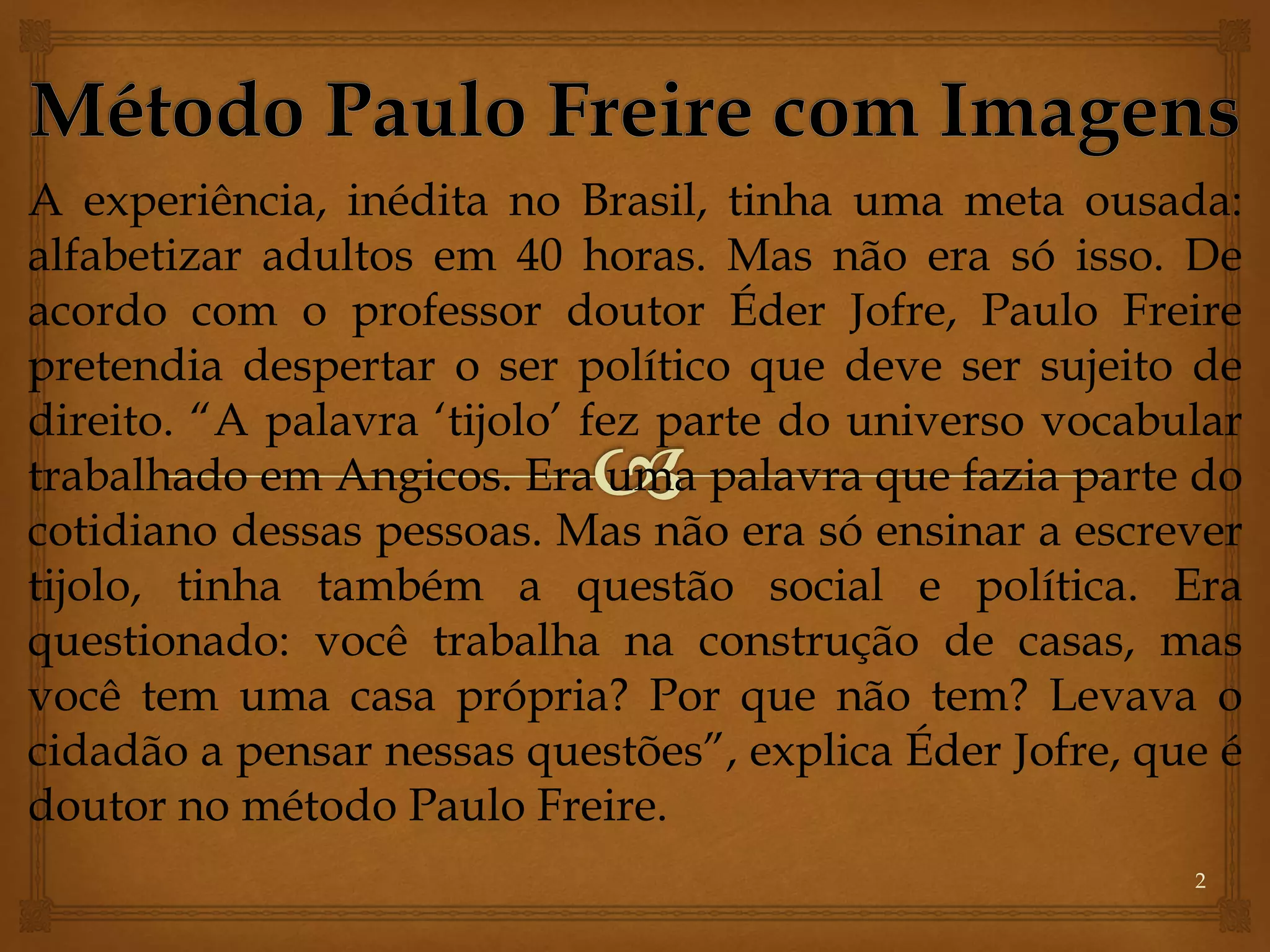 O documento discute a metodologia de alfabetização desenvolvida por Paulo Freire, destacando a importância das 'palavras geradoras' que refletem a realidade dos alunos e promovem uma consciência crítica. O método é dividido em três etapas: investigação, tematização e problematização, visando à transformação social e ao empoderamento do educando. Freire critica a alfabetização tradicional, enfatizando que a educação deve ser um ato político e libertador.