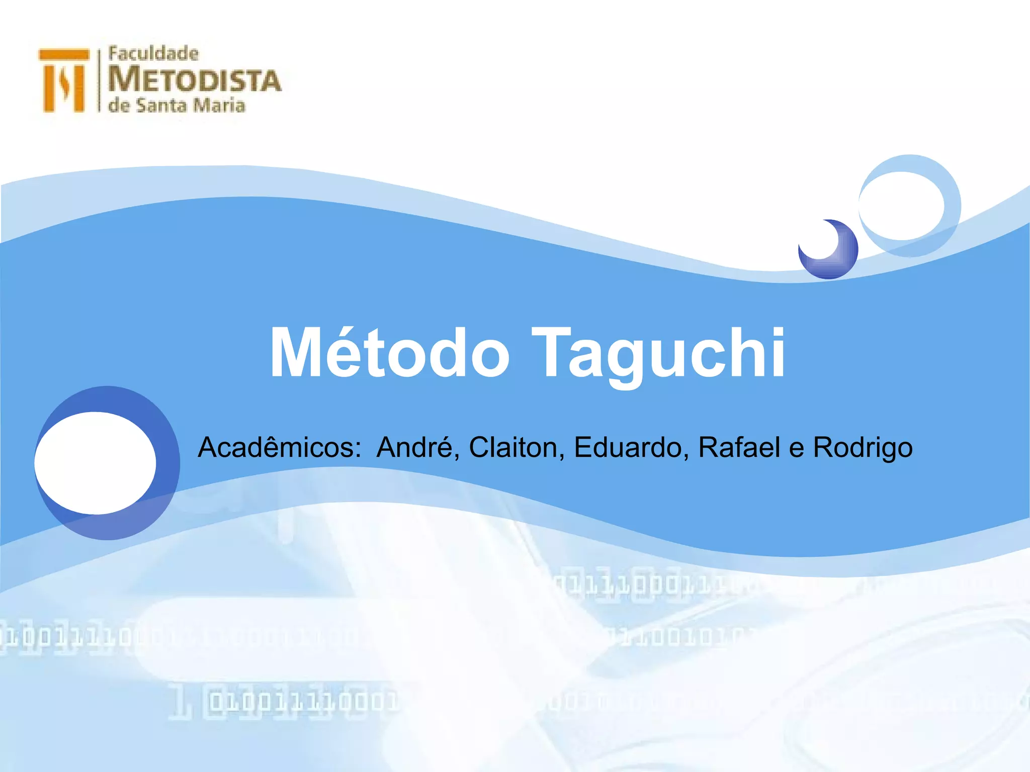 O documento descreve o método Taguchi de engenharia da qualidade, que busca aumentar a robustez dos produtos diminuindo os efeitos dos parâmetros de "ruído". Explica que a qualidade é medida pelo desvio em relação ao valor esperado e que os ruídos causam esses desvios. Apresenta também as etapas do método: identificação dos fatores, planejamento dos experimentos, predição dos níveis ótimos e validação dos resultados.