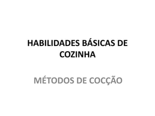 O documento descreve os principais métodos de cocção, incluindo calor seco, úmido e misto. Também discute métodos contemporâneos como microondas, forno de convecção, fritadeira digital e cocção sous-vide. O objetivo é apresentar as diferentes técnicas culinárias e como cada uma afeta a textura, sabor e cor dos alimentos.