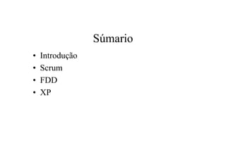 O documento descreve três métodos ágeis de desenvolvimento de software: Scrum, Feature Driven Development (FDD) e Extreme Programming (XP). Ele explica os princípios e práticas de cada método, como pequenas iterações, envolvimento do cliente, programação em pares e testes automatizados.