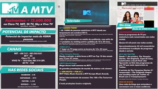 O documento fornece informações sobre o desempenho da MTV no Brasil, incluindo: audiência de 12,6 milhões de assinantes, crescimento de 145% na audiência entre jovens de 18-24 anos, e potencial de impactar mais de 40 milhões de pessoas. Também descreve formatos como o MTV News para veicular conteúdo de marcas patrocinadoras.