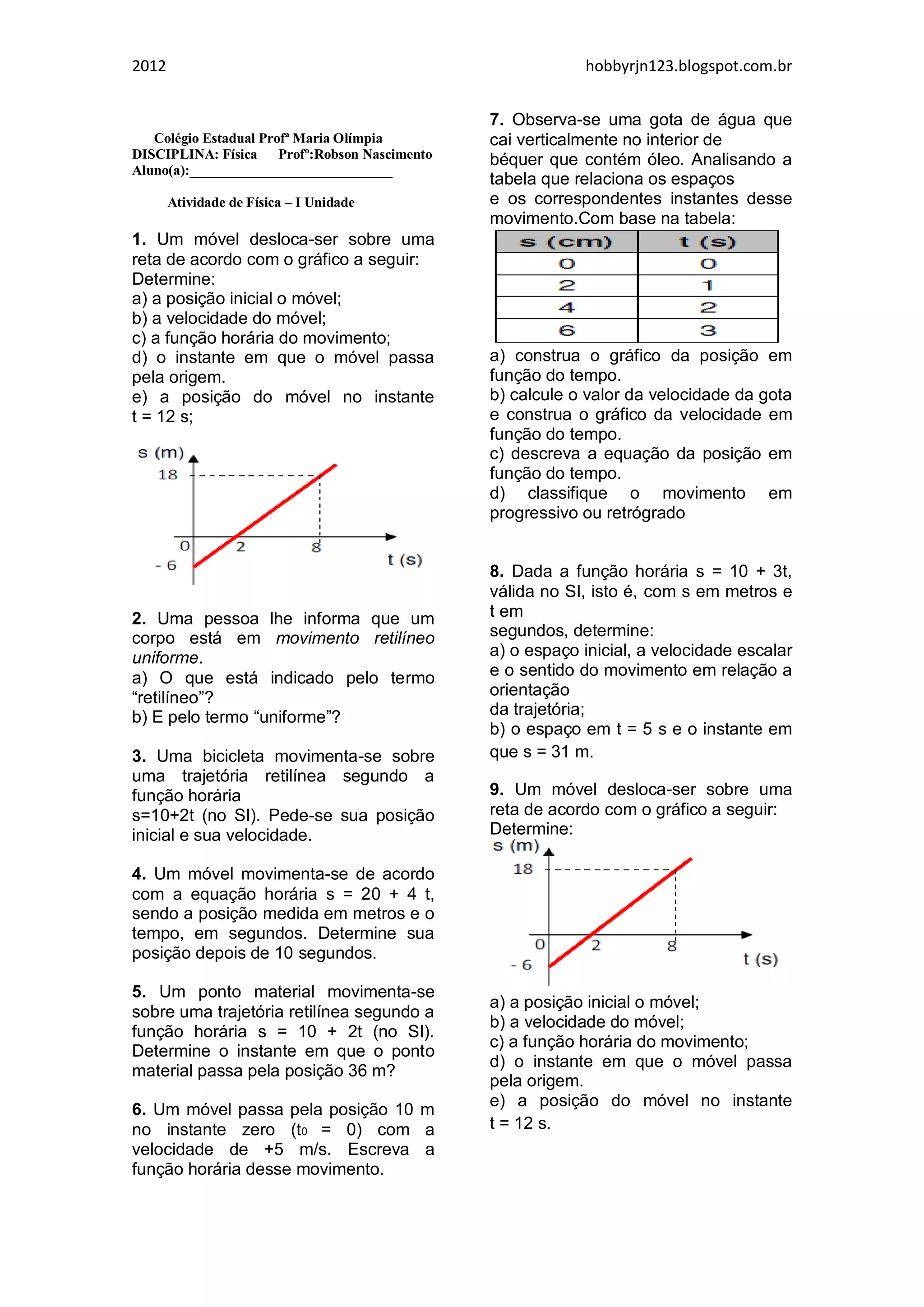 Este documento apresenta 10 exercícios sobre conceitos básicos de movimento uniforme e não uniforme, incluindo gráficos de posição versus tempo e funções horárias. Os exercícios abordam determinar posições iniciais, velocidades, funções horárias e classificar tipos de movimento a partir de gráficos e equações matemáticas.