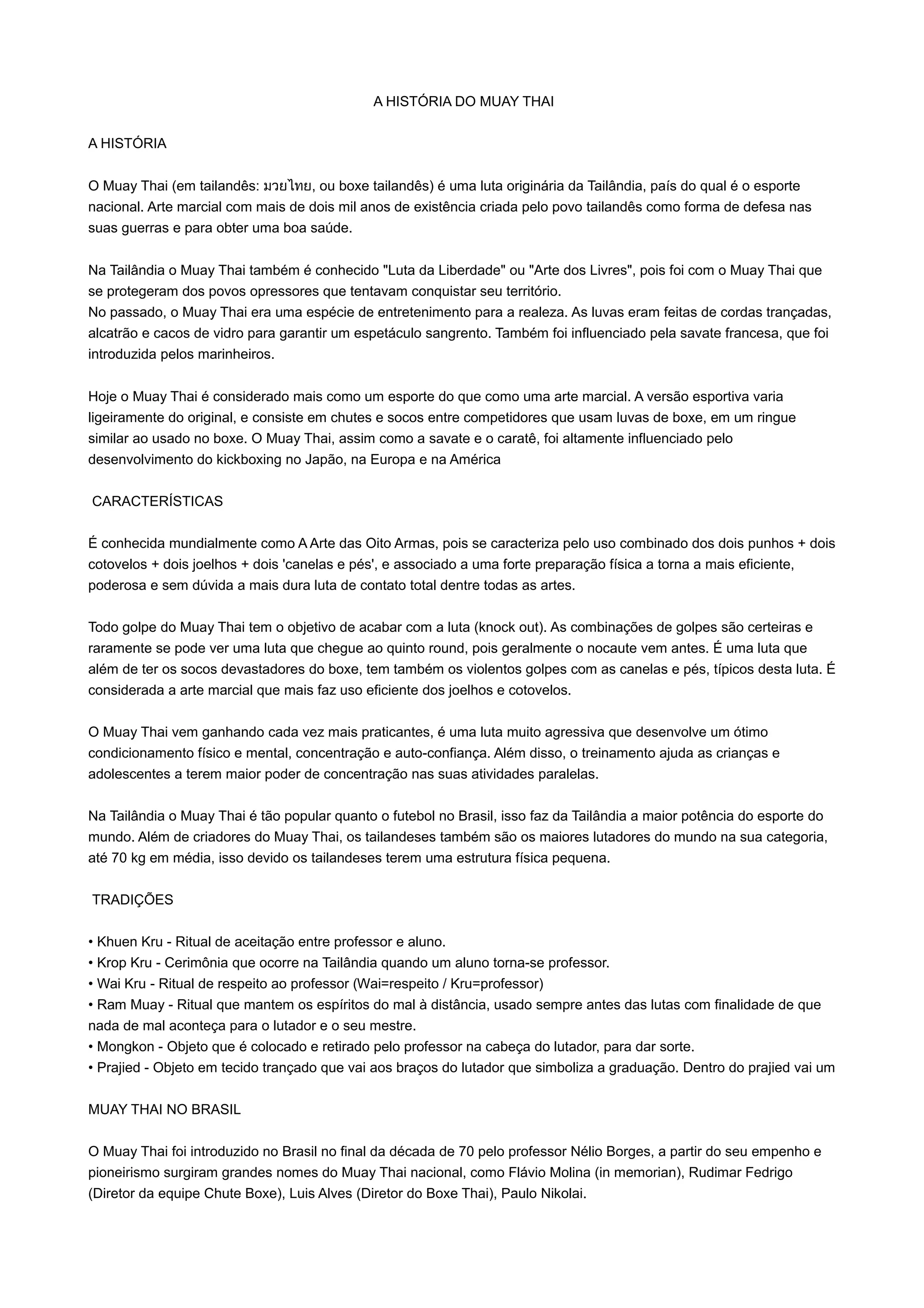 O Muay Thai é uma arte marcial tailandesa de mais de 2 mil anos usada para defesa e saúde. Originalmente um entretenimento real, hoje é um esporte com chutes, socos e regras. Caracteriza-se pelo uso de 8 partes do corpo e visa nocaute. É extremamente popular na Tailândia e influenciou estilos como kickboxing.
