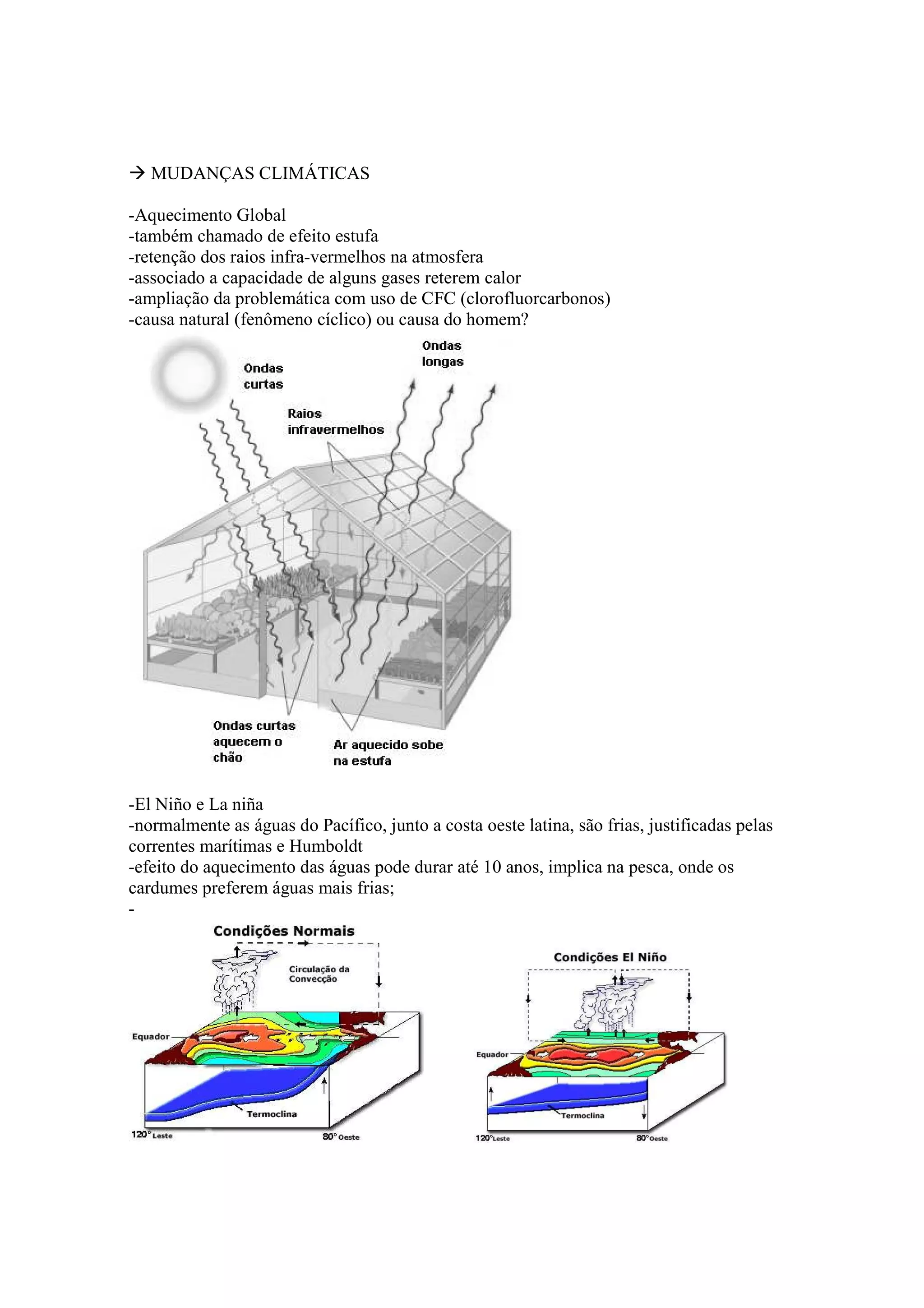 O documento discute os principais aspectos relacionados às mudanças climáticas, incluindo o aquecimento global causado pela retenção de gases de efeito estufa na atmosfera, fenômenos como El Niño e La Niña, ilhas de calor urbanas, inversão térmica e chuvas ácidas.