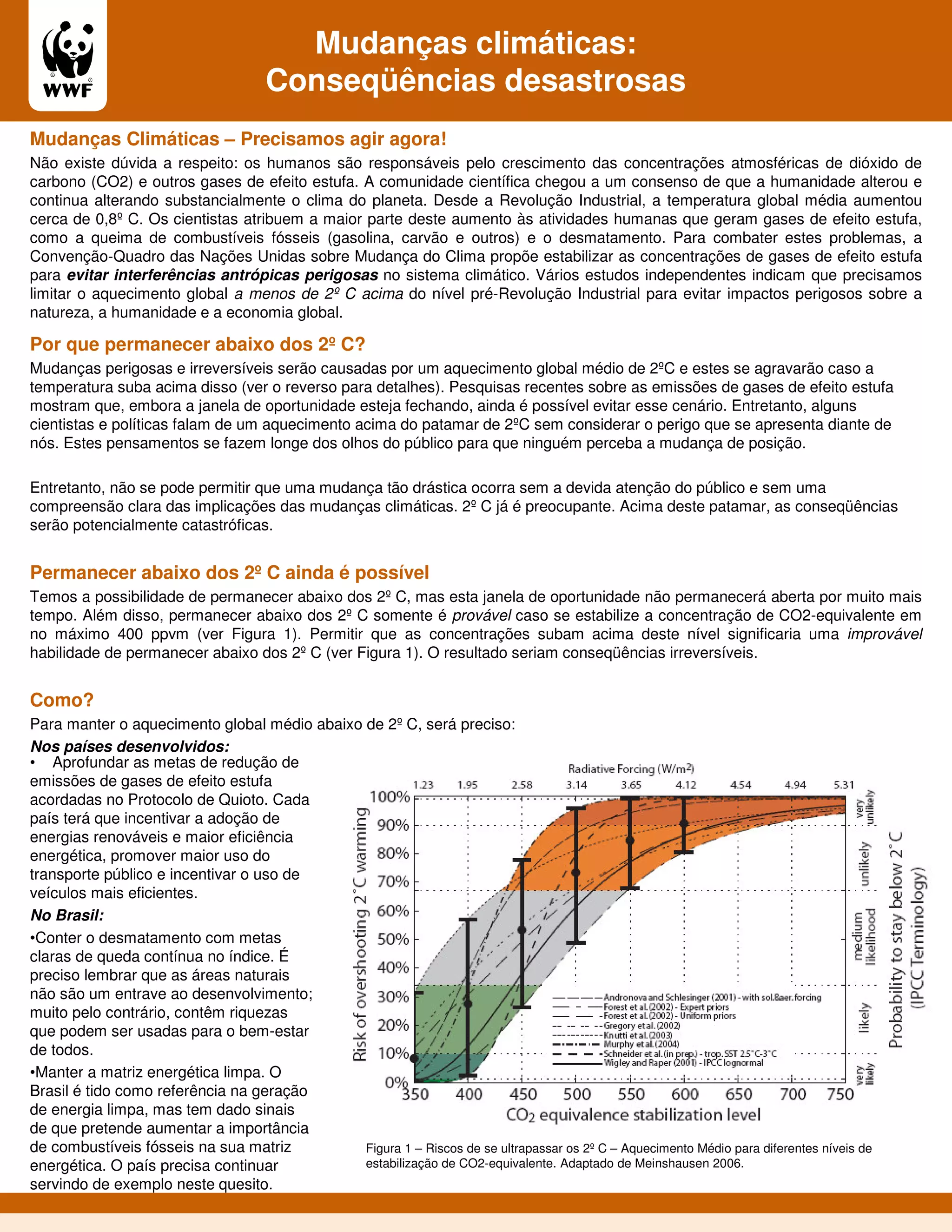 O documento discute os riscos das mudanças climáticas e como limitar o aquecimento global a menos de 2°C. Permanecer abaixo deste limite é crucial para evitar impactos desastrosos na natureza, humanidade e economia. A janela de oportunidade para limitar o aquecimento a 2°C está se fechando rapidamente e requer reduções imediatas nas emissões de gases de efeito estufa em todo o mundo.