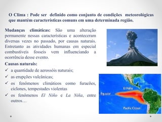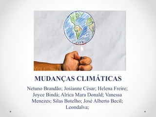 Este documento discute as mudanças climáticas, suas causas naturais e humanas, efeito estufa, consequências regionais no Brasil e iniciativas internacionais. Ele também aborda a mitigação das mudanças climáticas no Brasil por meio de programas como o PROÁLCOOL e BIODIESEL.