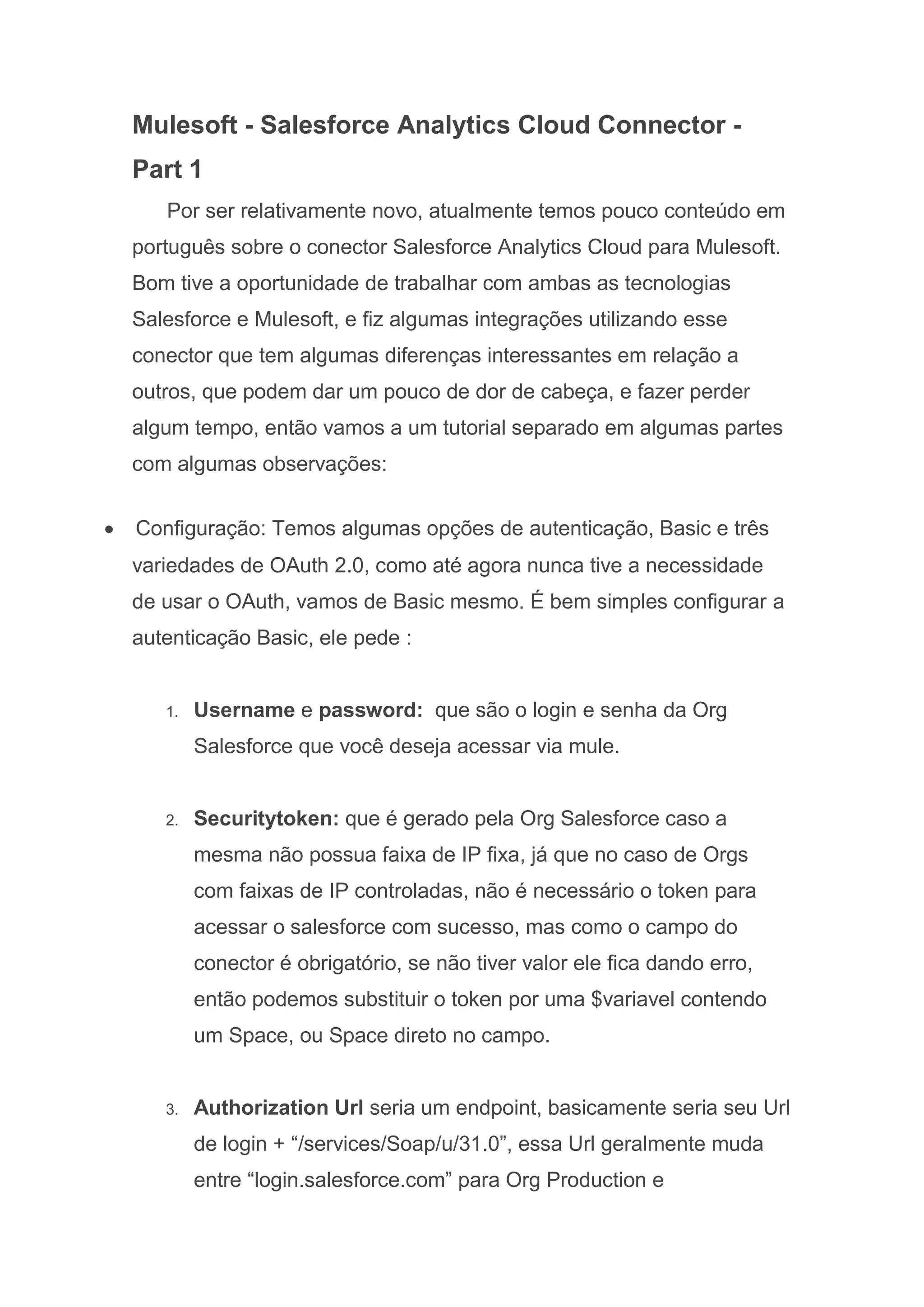 Este documento discute a configuração do conector Salesforce Analytics Cloud para Mulesoft, incluindo a autenticação básica, o arquivo de metadados JSON e um exemplo de configuração para upload de dados externos em um novo conjunto de dados no Wave Analytics. Na parte 2, explicará cada campo da configuração.