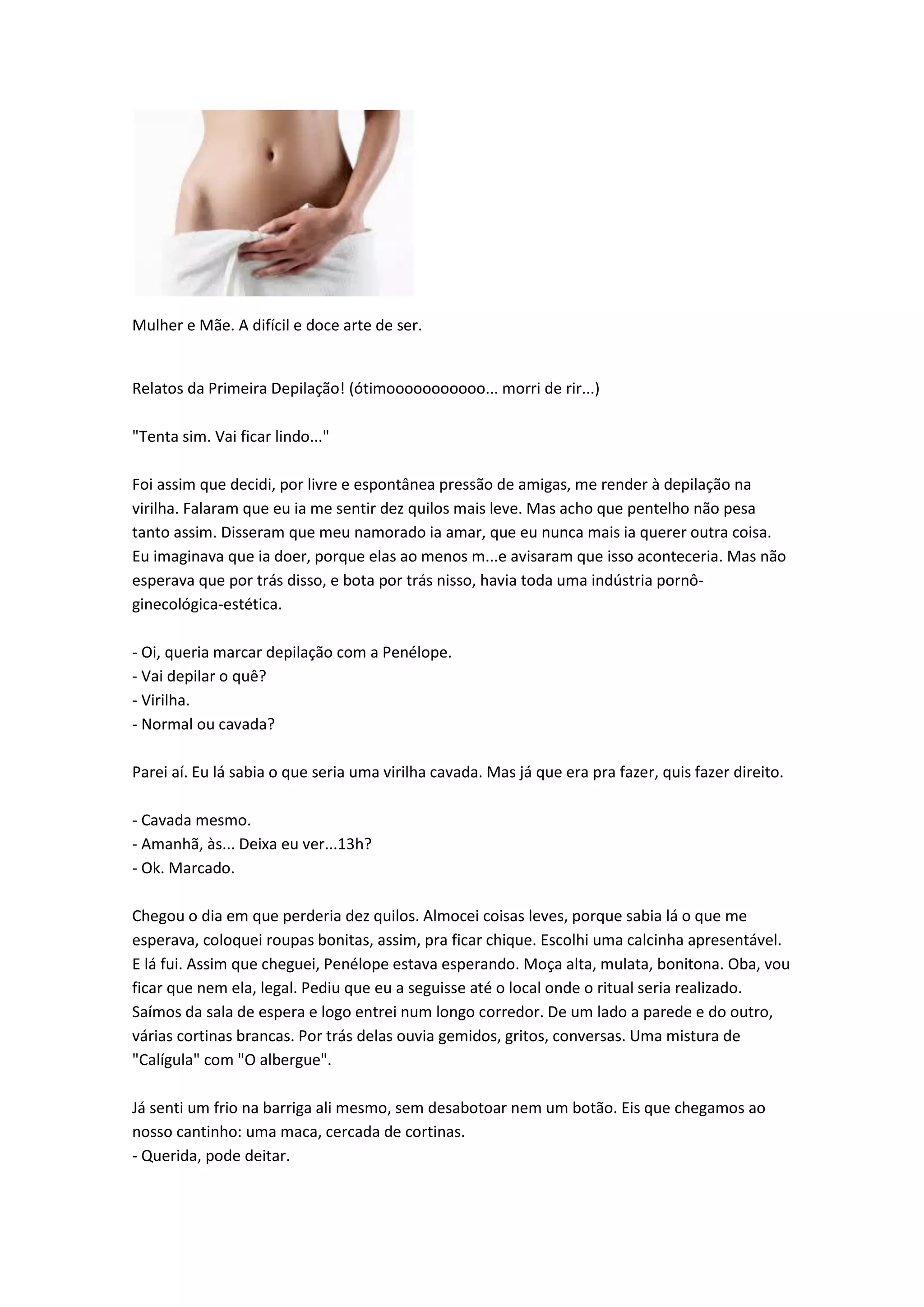 A autora relata sua primeira experiência de depilação íntima, que foi mais traumática do que o esperado. A depiladora realizou o procedimento de forma invasiva, deixando a autora em situação de extrema vulnerabilidade e desconforto, ao ponto de querer chorar. A depilação foi dolorosa e a autora passou a questionar os motivos que levam as mulheres a se submeterem a esse tipo de procedimento.