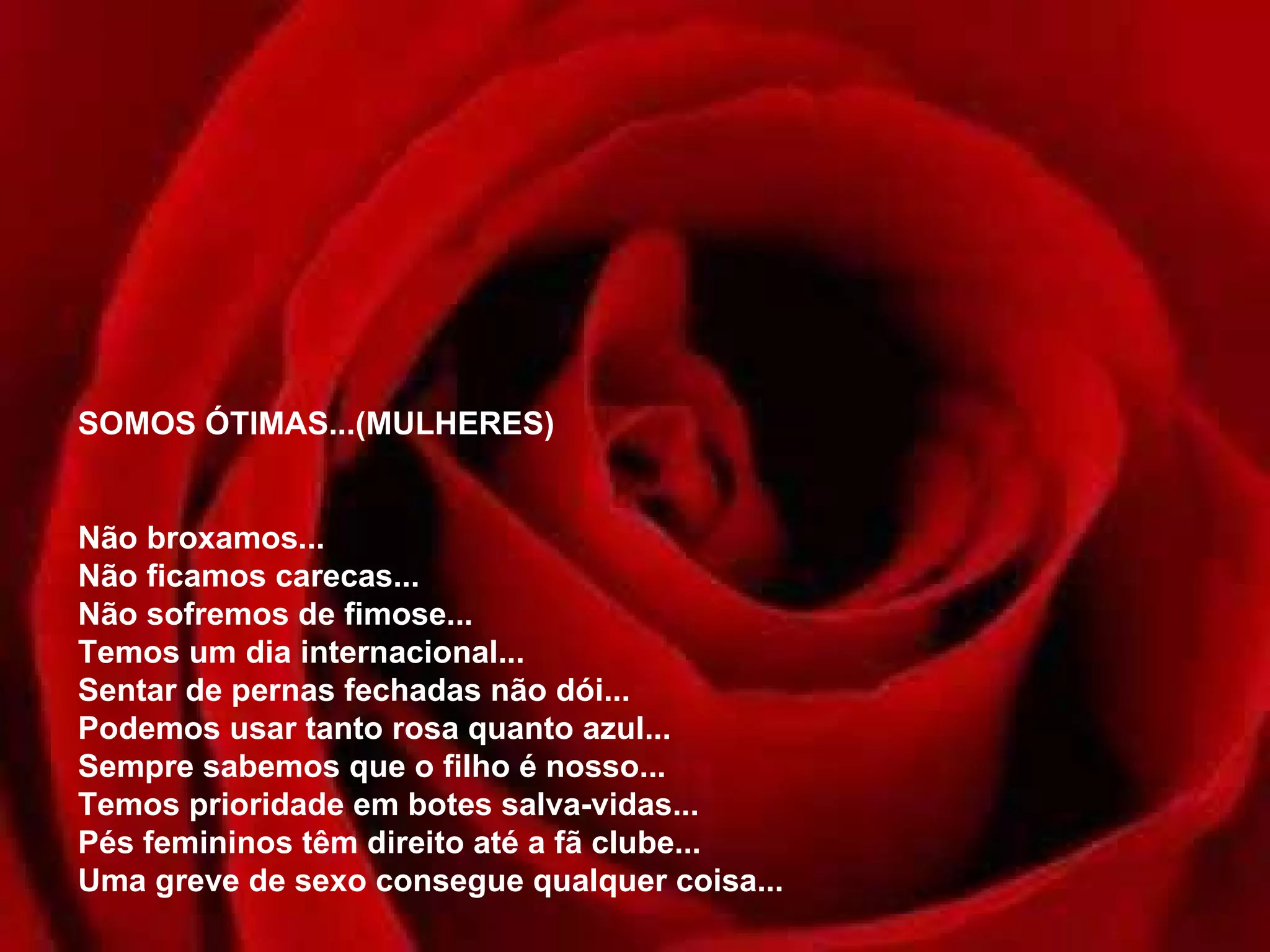 Este documento lista várias qualidades e privilégios das mulheres, como não sofrer de calvície ou fimose, terem prioridade em botes salva-vidas, poderem usar roupas de cores variadas, e serem capazes de chamar a atenção de várias coisas ao mesmo tempo, entre outros. Ele também aborda estereótipos de gênero e double standards em relação ao papel e percepção de mulheres e homens na sociedade.