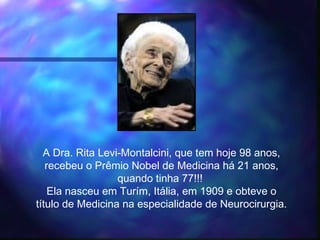 A Dra. Rita Levi-Montalcini, de 98 anos, recebeu o Prêmio Nobel de Medicina há 21 anos por sua descoberta do Fator de Crescimento Nervoso. Ela continua ativa na pesquisa científica e trabalha para fornecer bolsas de estudo para meninas africanas. Levi-Montalcini acredita que manter o cérebro ativo e estimulado é a chave para um envelhecimento saudável.