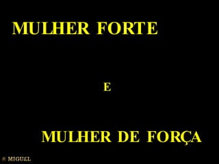 O documento contrasta as características de uma mulher forte fisicamente com as de uma mulher forte em espírito, destacando que esta última constrói relacionamentos, demonstra coragem diante do medo, dá o melhor de si para os outros, aprende com os erros e tem graça e fé.