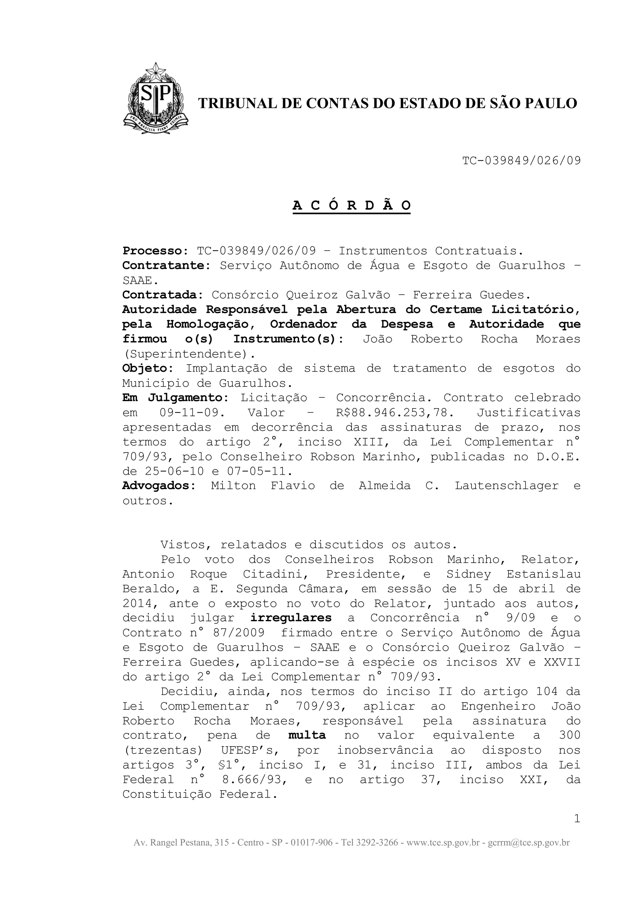 O Tribunal de Contas do Estado de São Paulo julgou irregular a licitação e o contrato firmado entre o Serviço Autônomo de Água e Esgoto de Guarulhos e o Consórcio Queiroz Galvão - Ferreira Guedes para implantação de sistema de tratamento de esgotos no valor de R$88.946.253,78. Aplicou multa de 300 UFESP's ao engenheiro João Roberto Rocha Moraes, responsável pela assinatura do contrato, por descumprir leis federais e a Constituição.