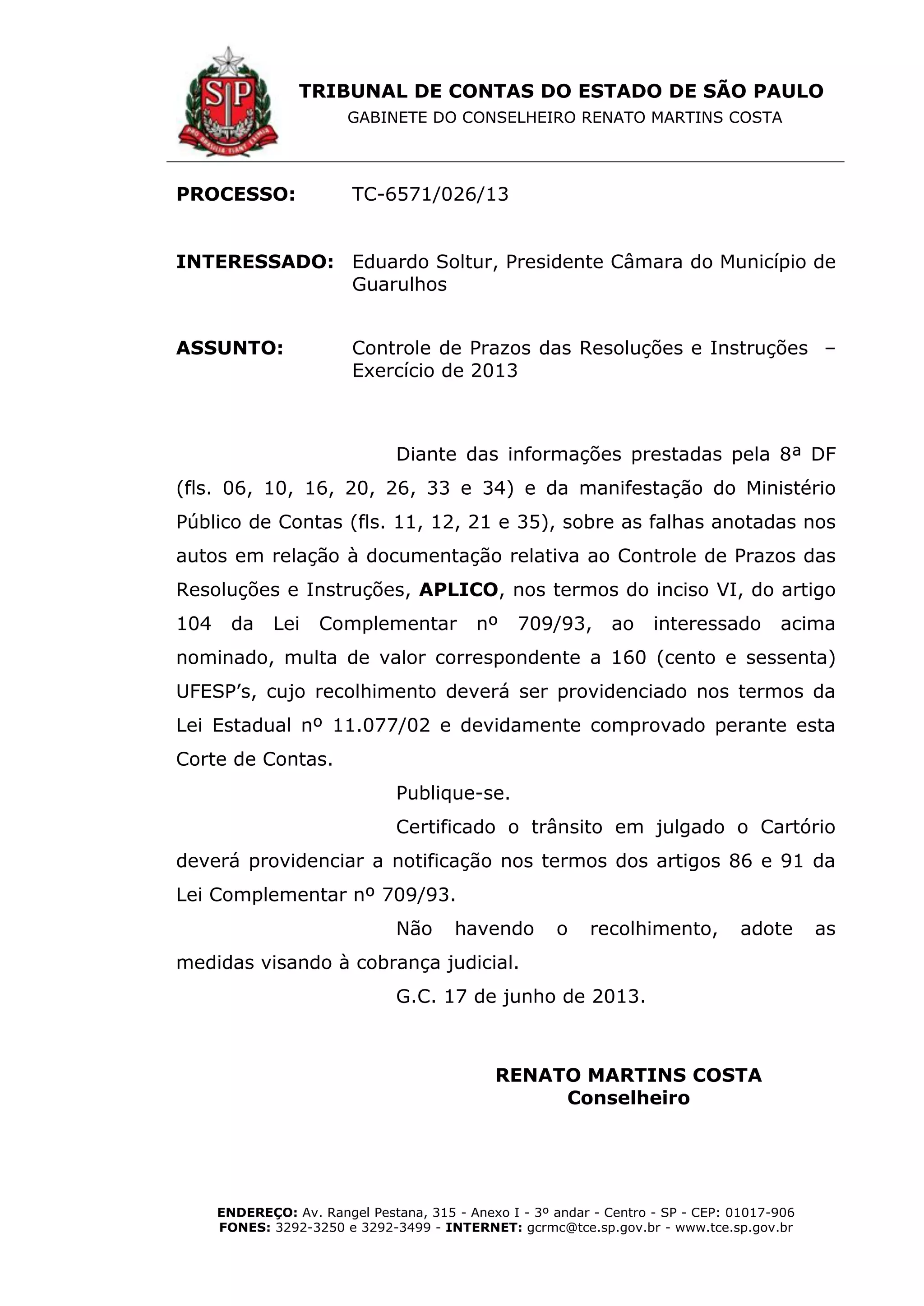 O documento descreve uma decisão do Tribunal de Contas do Estado de São Paulo aplicando uma multa de 160 UFESP's ao presidente da Câmara Municipal de Guarulhos devido a falhas na documentação relativa ao Controle de Prazos das Resoluções e Instruções no exercício de 2013. O presidente deverá recolher a multa nos termos da lei e, caso não o faça, medidas judiciais de cobrança serão adotadas.