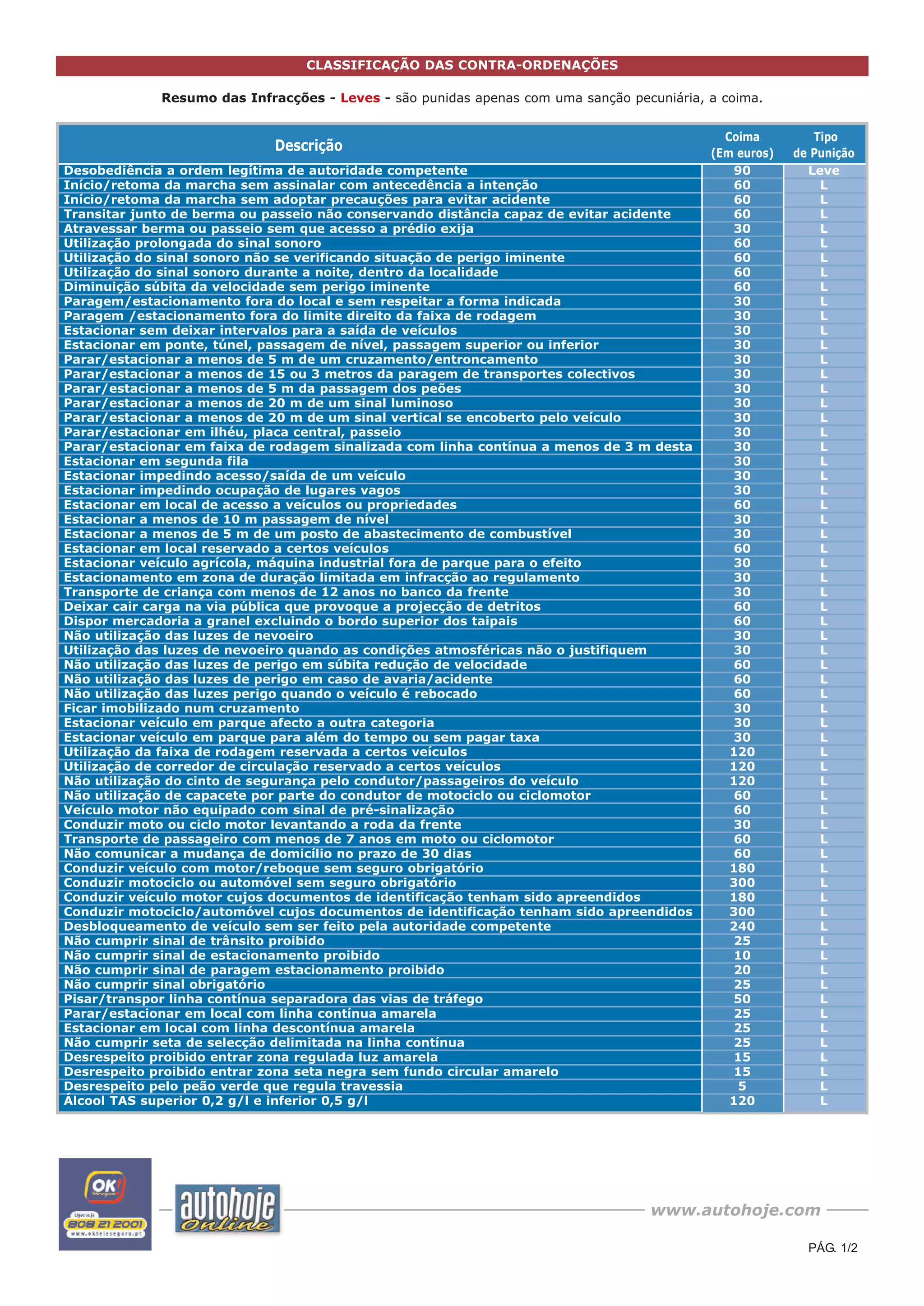 O documento classifica contra-ordenações de trânsito em Portugal em leves e graves. Contra-ordenações leves são punidas apenas com multa, enquanto contra-ordenações graves recebem multa e podem levar à suspensão da carta de condução. A lista fornece exemplos de infrações leves, como estacionar irregularmente ou não usar cinto de segurança, e exemplos de infrações graves, como dirigir em sentido proibido ou realizar manobras perigosas.