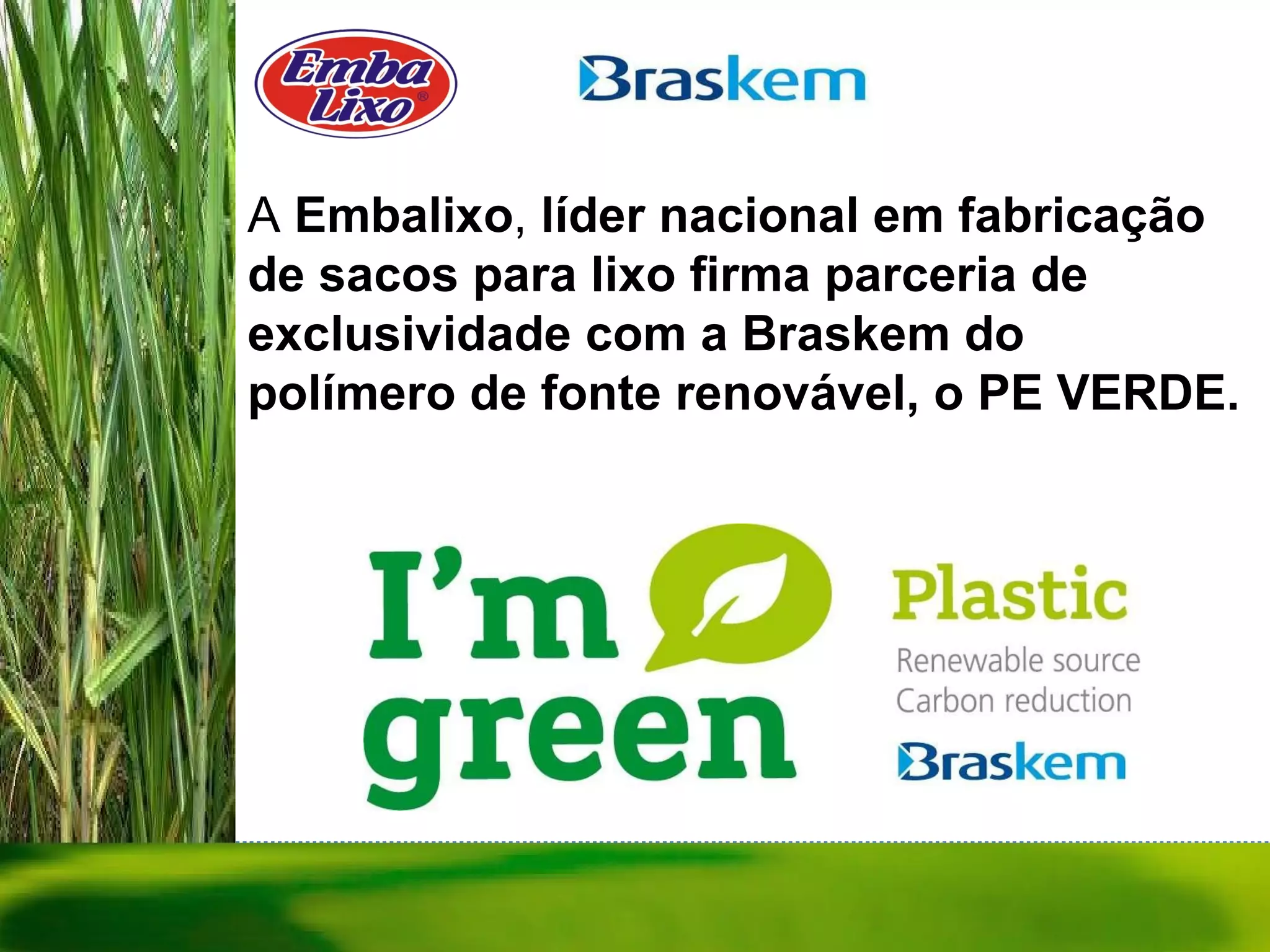 A Embalixo firmou uma parceria exclusiva com a Braskem para produzir sacos de lixo sustentáveis feitos de PE VERDE, um polímero renovável feito de cana-de-açúcar brasileira que captura CO2 e é 100% reciclável, mantendo a qualidade. A projeção é que 2.000 toneladas desses sacos no primeiro ano reduzam as emissões de CO2 em 10.000 toneladas em comparação com sacos de petróleo, equivalente às emissões de 5.000 carros ou do consumo de ener