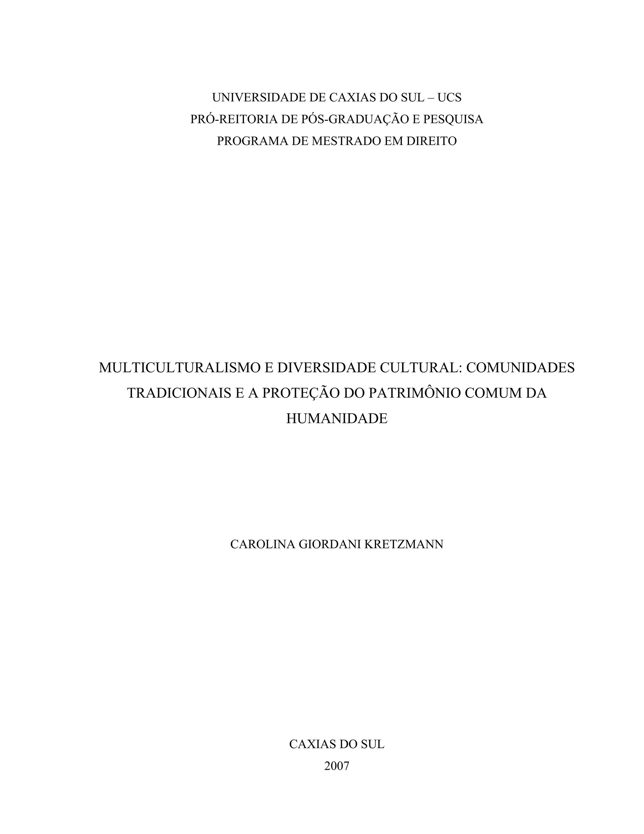 A dissertação investiga a importância do reconhecimento das culturas das comunidades tradicionais brasileiras para a preservação da diversidade cultural e proteção do patrimônio comum da humanidade. Aborda temas como universalismo, diferencialismo, e a relação sustentável dessas comunidades com o meio ambiente, evidenciando suas lutas por direitos coletivos. A pesquisa destaca a necessidade de diálogo intercultural e compreensão entre as culturas como essenciais para a construção de uma sociedade multicultural.