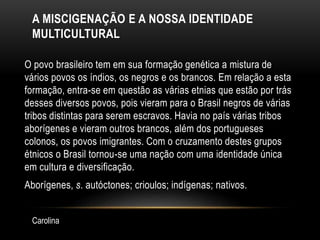 O documento discute a formação da identidade multicultural brasileira através da miscigenação entre indígenas, negros e brancos. Também aborda os desafios enfrentados por alguns grupos étnicos no país e o papel da escola em formar cidadãos conscientes e combater o preconceito por meio de práticas docentes inclusivas.