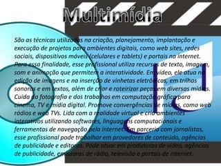 de publicidade e editoras. Pode atuar em produtoras de vídeo, agências