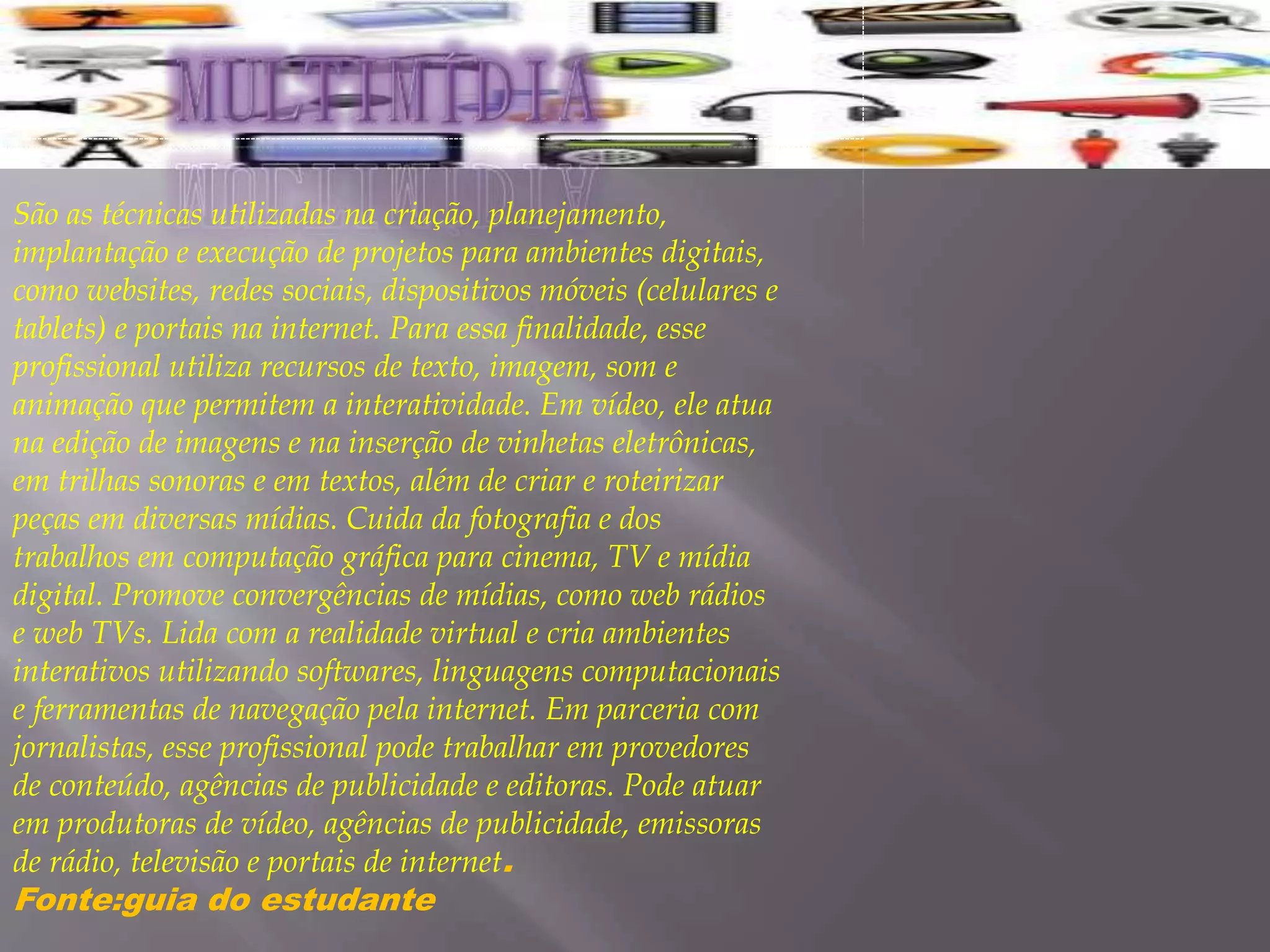 O documento descreve a profissão de designer multimídia, que cria projetos digitais utilizando recursos como texto, imagem, som e animação para proporcionar interatividade em websites, aplicativos e outras plataformas digitais. O profissional atua na edição de vídeo, criação de gráficos, realidade virtual e convergência de mídias para empresas de publicidade, comunicação e entretenimento.