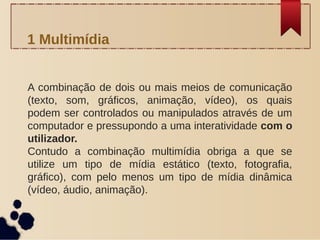 O documento discute o conceito de multimídia, definindo-a como a combinação de dois ou mais meios de comunicação como texto, som, gráficos e vídeo que podem ser manipulados através de um computador de forma interativa. Também apresenta os principais tipos de mídia que compõem um sistema multimídia e exemplos de suas aplicações.