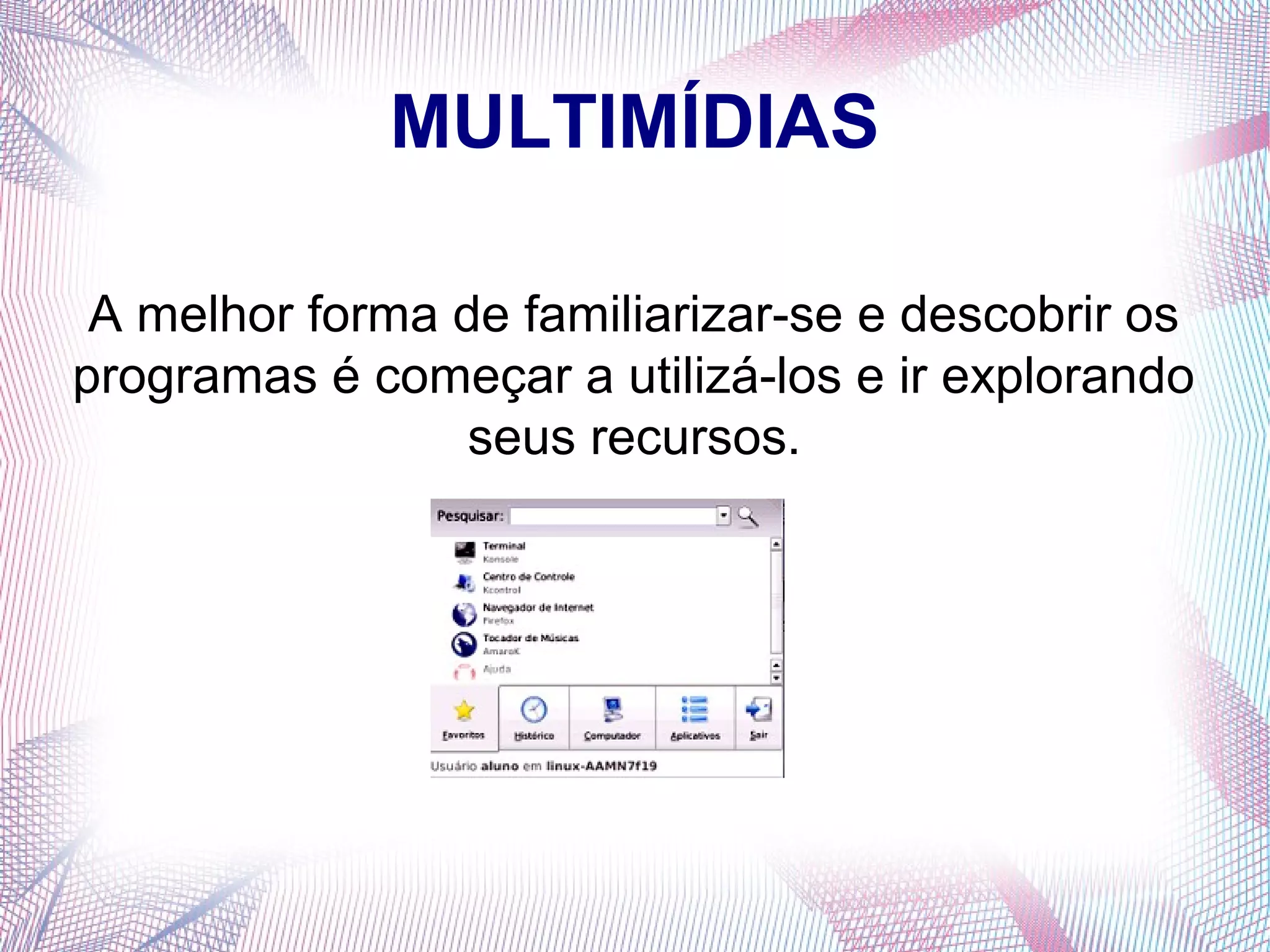 Este documento fornece instruções sobre como usar os programas de multimídia Audacity e Amarok para gravar, editar e reproduzir áudio. Ele explica como gravar áudio, aplicar efeitos como amplificação, importar arquivos de áudio e exportar projetos em formatos como MP3. Também descreve como usar o Amarok para criar listas de reprodução e reproduzir arquivos de áudio.