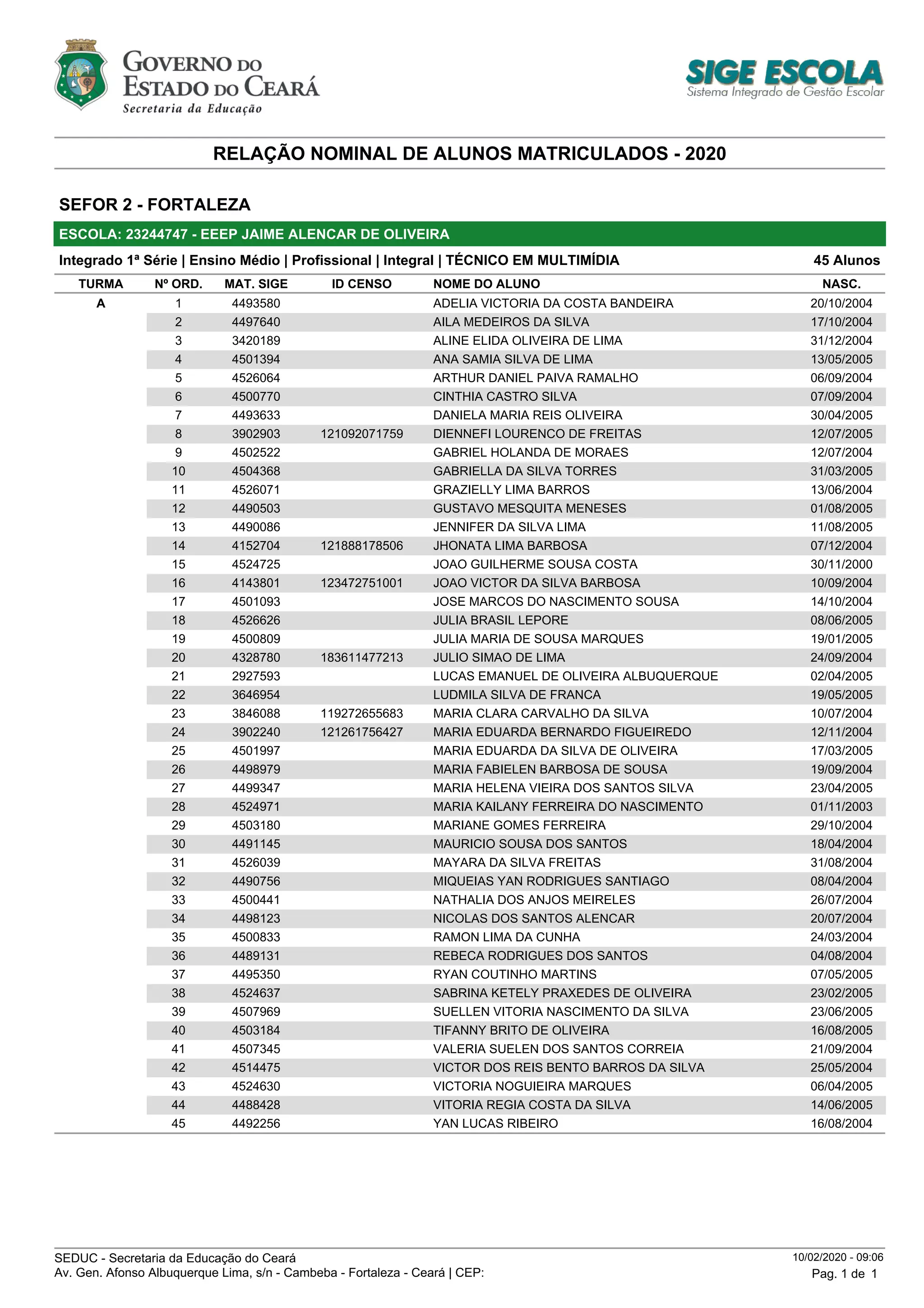 Este documento fornece uma lista nominal de 45 alunos matriculados no curso técnico em multimídia no ano de 2020 na Escola Estadual de Ensino Médio Jaime Alencar de Oliveira em Fortaleza. A lista contém o nome, data de nascimento, número de matrícula e outros dados de identificação de cada aluno.