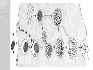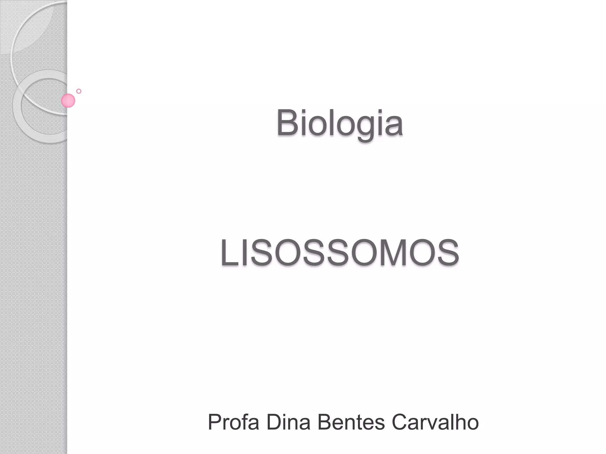 O documento descreve os lisossomos como vesículas membranosas que contêm enzimas digestivas e estão envolvidas na digestão intracelular e autofagia. Os lisossomos fundem-se com vacúolos alimentares para digerir partículas que entraram na célula, e também digerem estruturas citoplasmáticas durante a autofagia, contribuindo para a renovação celular. Problemas nos lisossomos podem levar à liberação de enzimas e autodestruição celular.