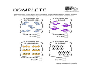 A multiplicação é uma forma de adicionar quantidades iguais de números. O produto é o resultado da multiplicação de dois fatores. A multiplicação permite simplificar cálculos ao invés de somar parcelas repetidas.