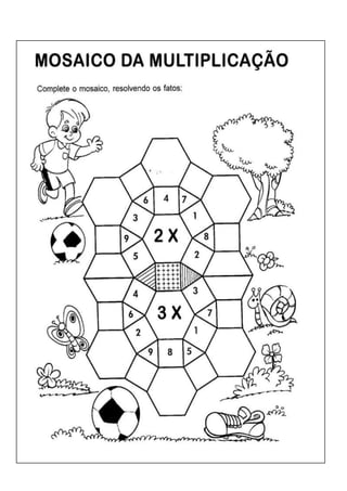O documento descreve uma atividade de matemática sobre a multiplicação. Alice aprende com um matemágico que a tabuada é uma maneira de facilitar cálculos multiplicativos, pois representa a soma de parcelas iguais. Ela entende que 4 x 8 é igual a 8 + 8 + 8 + 8, que dá 32. A atividade pede que os alunos completem um texto com números e anotem os números de calçado de colegas por extenso.