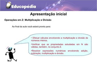 O documento apresenta os conceitos de multiplicação e divisão de números inteiros no conjunto Z, incluindo: