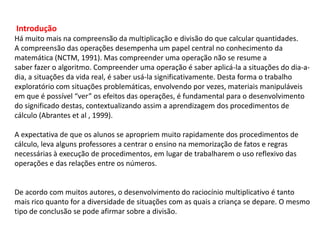Este documento discute a importância de desenvolver a compreensão conceitual de multiplicação e divisão através de experiências com problemas do mundo real. Sugere que os alunos explorem situações problemáticas envolvendo materiais manipuláveis para contextualizar o aprendizado dos procedimentos de cálculo. Também apresenta uma série de atividades para os anos iniciais focadas em desenvolver o significado das operações por meio de problemas significativos.