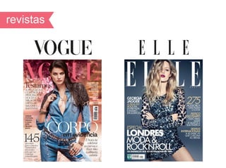 O documento discute as diferenças visuais entre as revistas Vogue e Elle, incluindo o contraste de cores entre imagens e texto, o uso de tipografias serifadas e não serifadas, e como cada uma representa moda e estilo por meio de sua tipografia e layout de página.