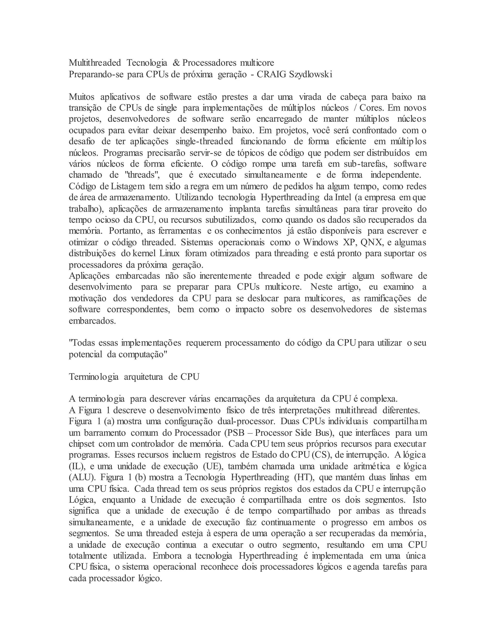 1) Muitos aplicativos de software precisarão ser modificados para aproveitar processadores multicore, dividindo tarefas em threads para serem executadas simultaneamente.
