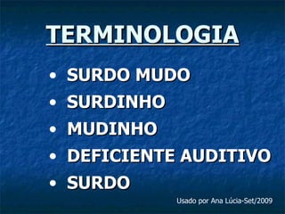 O documento discute os diferentes tipos de surdez e a cultura surda no Brasil. Apresenta termos relacionados à surdez, como surdo, surdo oralizado, surdo profundo e surdo implantado. Também aborda a inclusão de surdos na sala de aula, a Língua Brasileira de Sinais e aspectos da cultura surda, como a identidade e meios de comunicação.