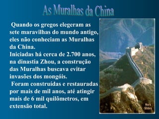 A Grande Muralha da China foi construída ao longo de milênios para proteger o país das invasões dos mongóis, atingindo mais de 6 mil quilômetros de extensão total ao longo de 9 províncias. Reconstruída na dinastia Ming entre 1368 e 1568, é considerada uma das sete maravilhas do mundo e faz parte do patrimônio cultural mundial da UNESCO, atraindo muitos turistas chineses e estrangeiros.