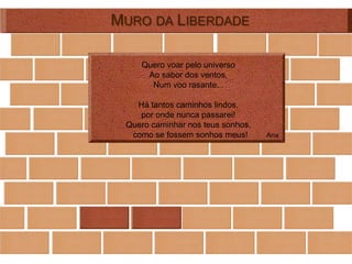 O documento consiste em várias contribuições de diferentes autores sobre o tema da liberdade, expressando-a através de poemas, pensamentos e reflexões. As contribuições descrevem a liberdade como voar, sonhar, respirar, sorrir e ter esperança.
