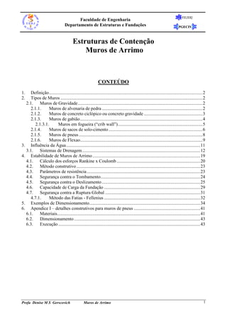 Este documento discute diferentes tipos de muros de contenção, incluindo muros de gravidade feitos de alvenaria, concreto, gabiões ou pneus. Também aborda sistemas de drenagem para muros, estabilidade de muros, cálculos de esforços e segurança, e exemplos de dimensionamento de muros.