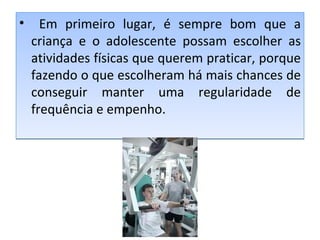 Estudos recentes mostram que a musculação pode trazer benefícios para crianças e adolescentes desde os 6 anos de idade, contanto que seja realizada de forma segura e sob orientação de profissional. Deve-se respeitar as diferenças individuais e priorizar a repetição e coordenação dos movimentos com cargas leves no início. A prática deve ter como objetivo o desenvolvimento de qualidades físicas e não apenas ganho de massa muscular.